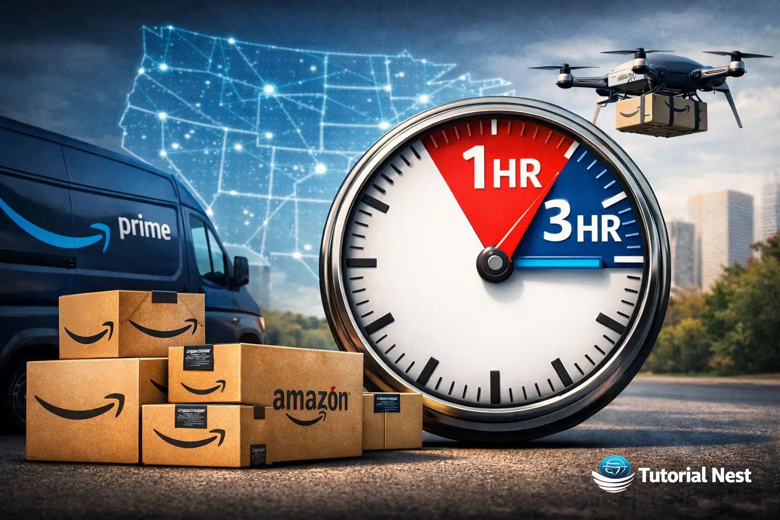 Amazon fast delivery with 1-hour and 3-hour options in the US, showing Amazon boxes, delivery van, drone, and Tutorial Nest logo.